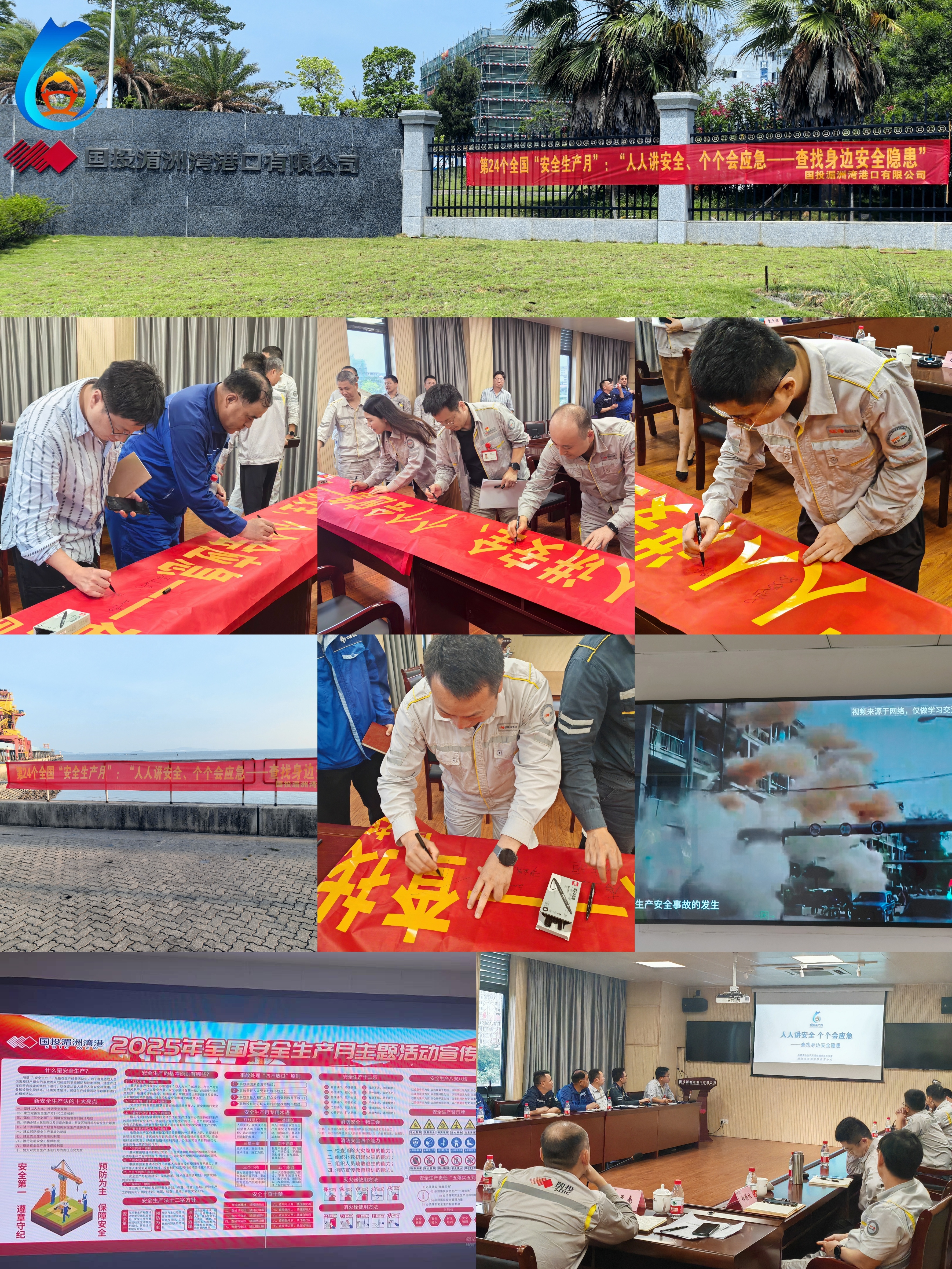 动员会现场还举行了安全生产月活动横幅签字仪式,与会人员郑重签名,许下安全生产承诺。安全与环境部在公司生活区、生产辅助区、码头区悬挂安全生产月主题横幅,在办公区、生产候工区的电子显示屏播放应急安全科普短视频、安全提示,并借助宣教大屏等载体组织现场宣传活动,打造安全宣传“室外课堂”,扩大宣传覆盖面和影响力,营造浓厚的安全生产氛围。